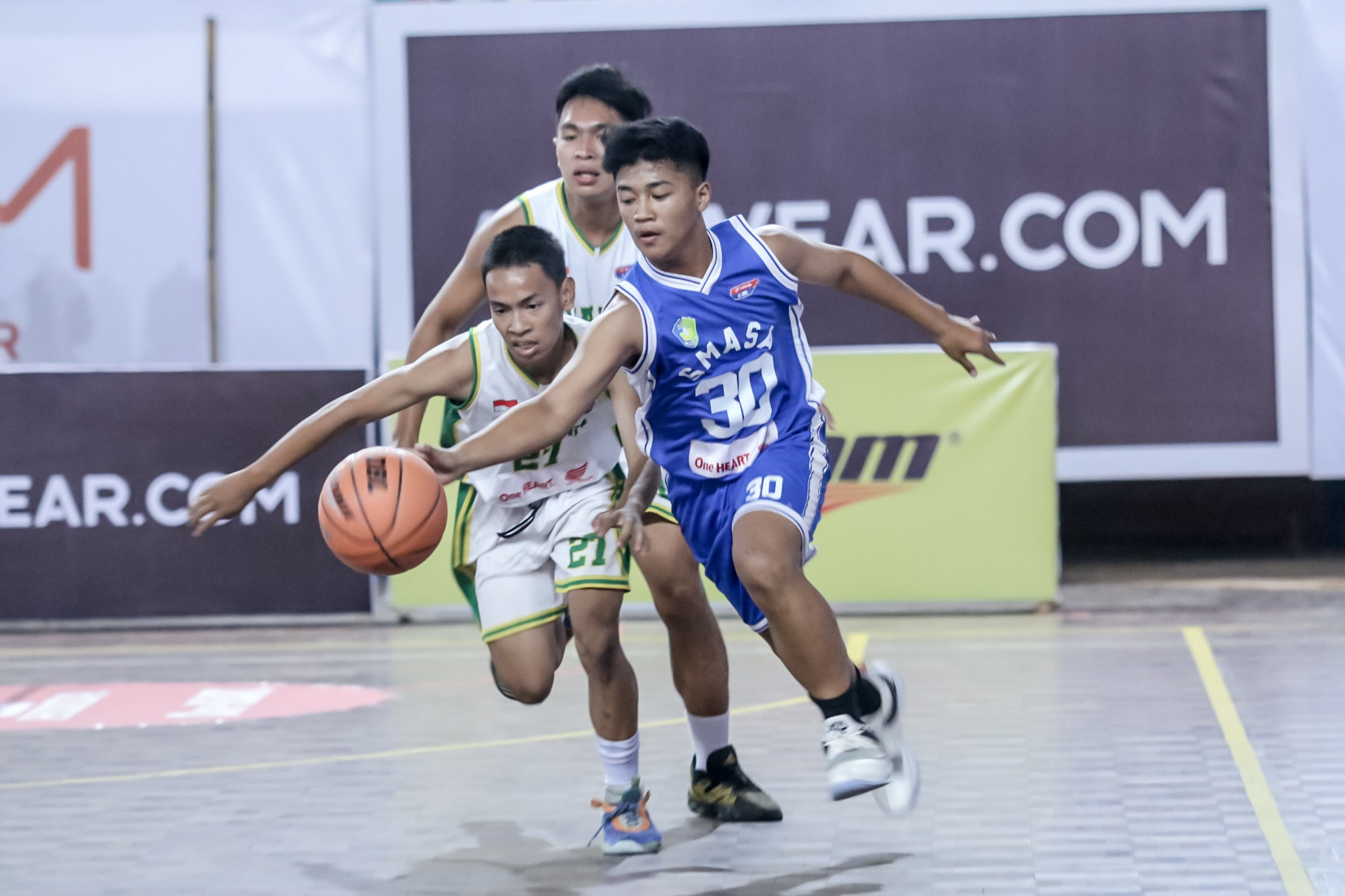 Ketat. Gim antara putra Smaboy (SMAN 1 Boyolangu) melawan Smasa Nganjuk (SMAN 1 Nganjuk) pada ajang Honda DBL with Kopi Good Day 2023 East Java Series-West Region berjalan panas. Laga yang berlangsung pada Selasa, 15 Agustus 2023 di Gelanggang Olahraga (GOR) Wilis Madiun ini sempat imbang pada paruh pertama (6-6).
