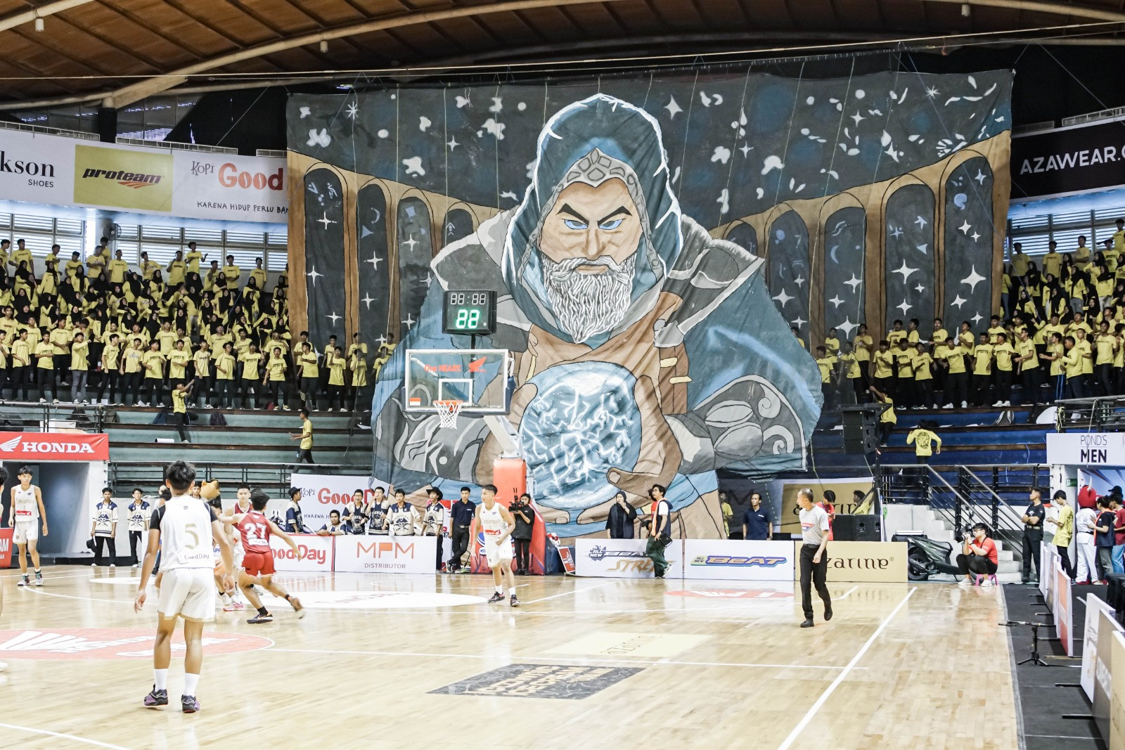 Kompak mengenakan baju kuning, Smamiotifo - sebutan tim suporter SMA Muhammadiyah 10 GKB Gresik memenuhi tribun sebelah barat. Total massa sebanyak 500 orang untuk mendukung basket putra sekolahnya bertanding di DBL Arena. Massa tersebut datang dari siswa-siswi, guru, orang tua, hingga alumni dari SMA Muhammadiyah 10 GKB Gresik loh.