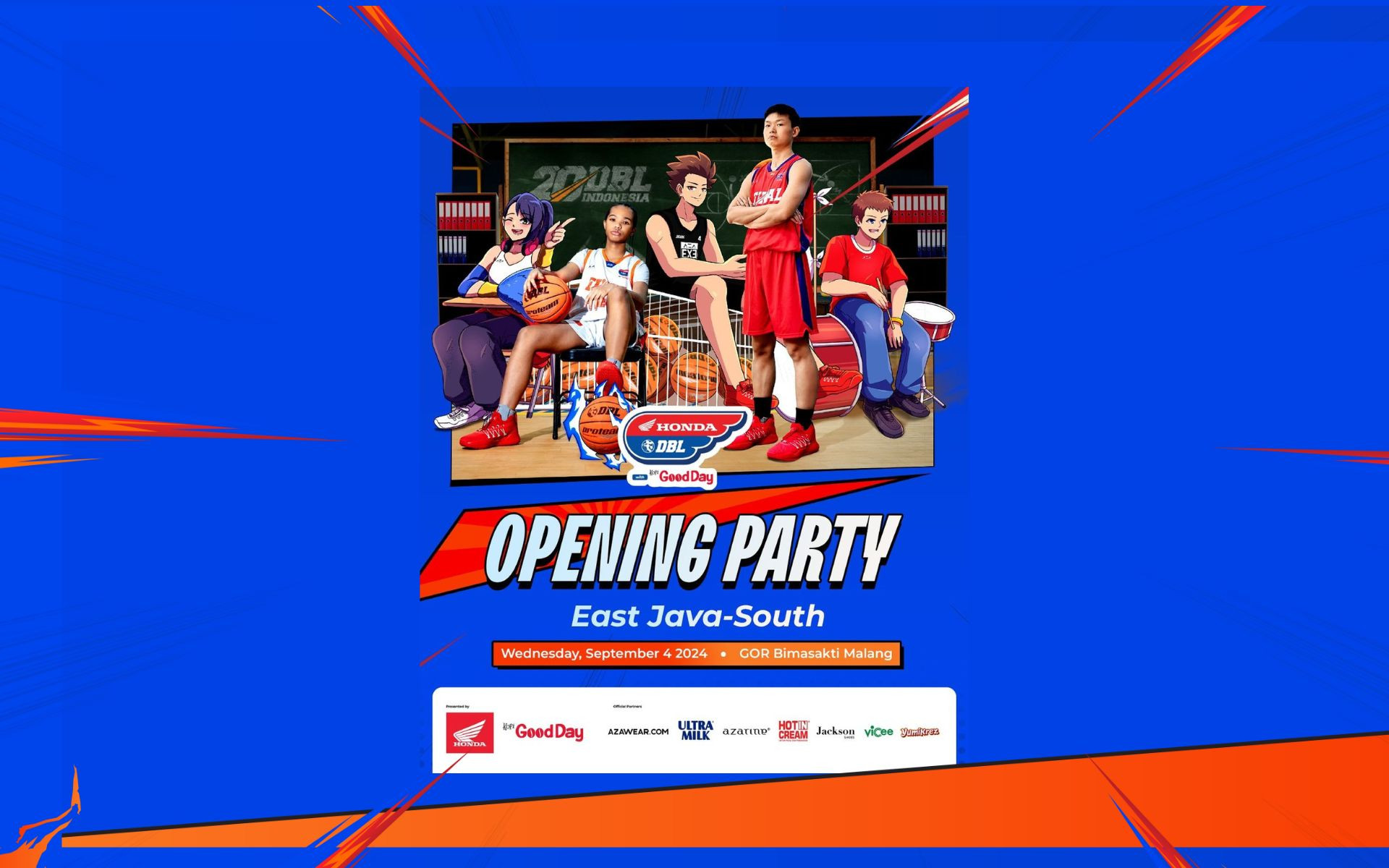 GOR Bimasakti Malang pasti bakal panas! Honda DBL with Kopi Good Day 2024 East Java-South berlangsung tepat pada Rabu, 4 September 2024. Ada tiga pertandingan yang bakal mewarnai Opening Party!