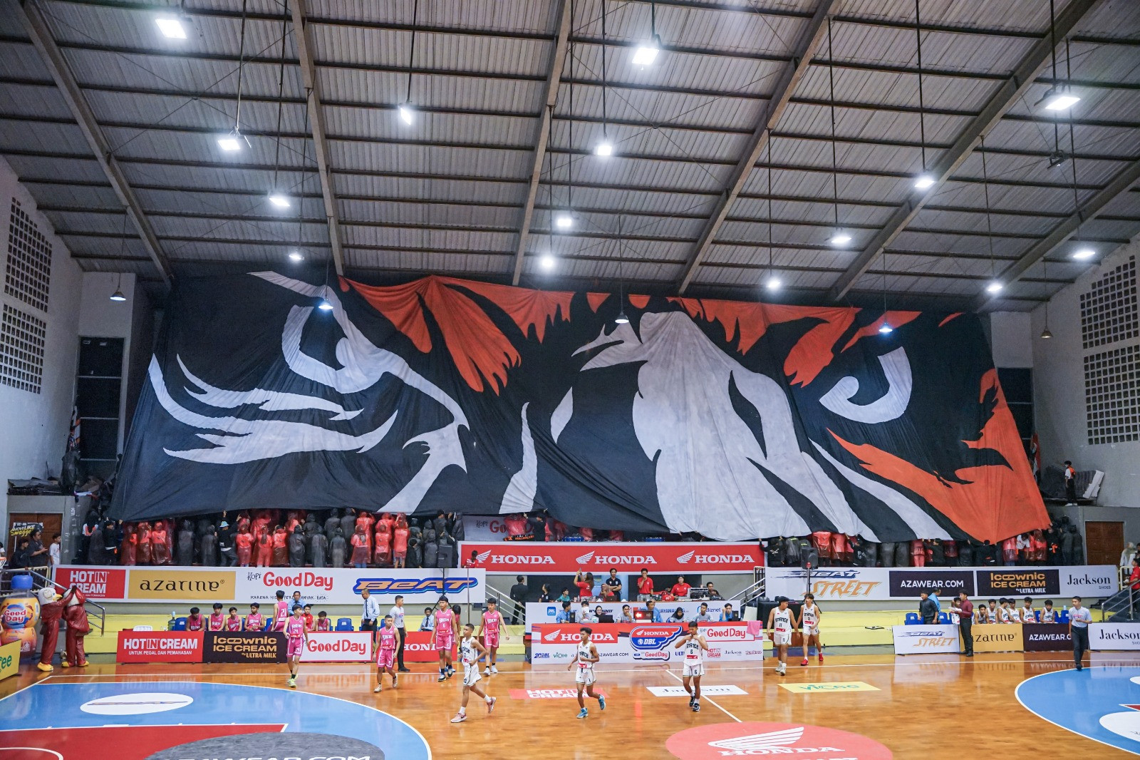 Honda DBL with Kopi Good Day 2024 East Java-South makin ramai. Salah satu ‘biang kerok’ yang membuat tribun GOR Bimasakti Malang terisi penuh adalah District Nine, suporter dari SMAN 9 Malang.