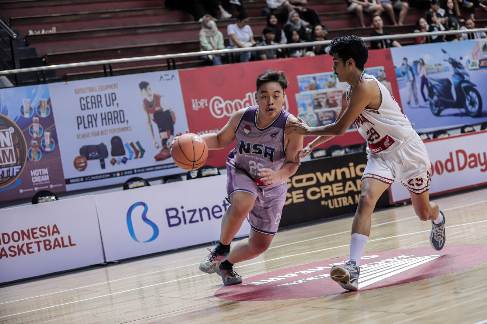 Daniel Sutisna, pemain basket putra SMA Nation Star Academy Surabaya (NSA) berhasil mencuri perhatian penonton DBL Arena pada Sabtu, 14 September 2024.