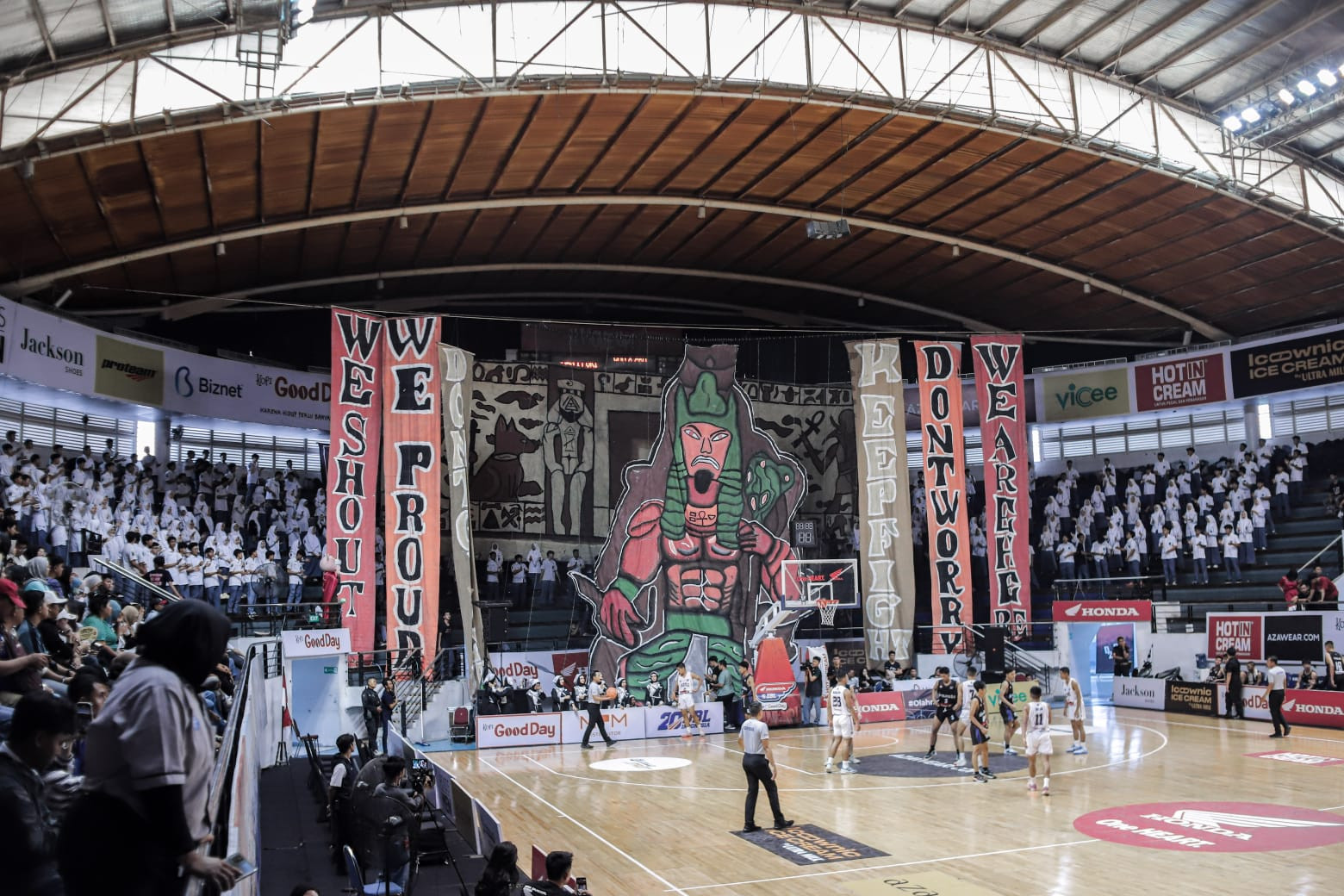 Sebuah banner bergambar singgasana dengan nuansa khas Mesir perlahan menghiasi tribun timur DBL Arena Surabaya. Tak ketinggalan juga enam long banner di sisi kiri dan kanan bertuliskan “We Shout”, “We Proud”, “Don’t Give Up”, “Keep Fight”, “Don’t Worry”, serta “We are Here”.