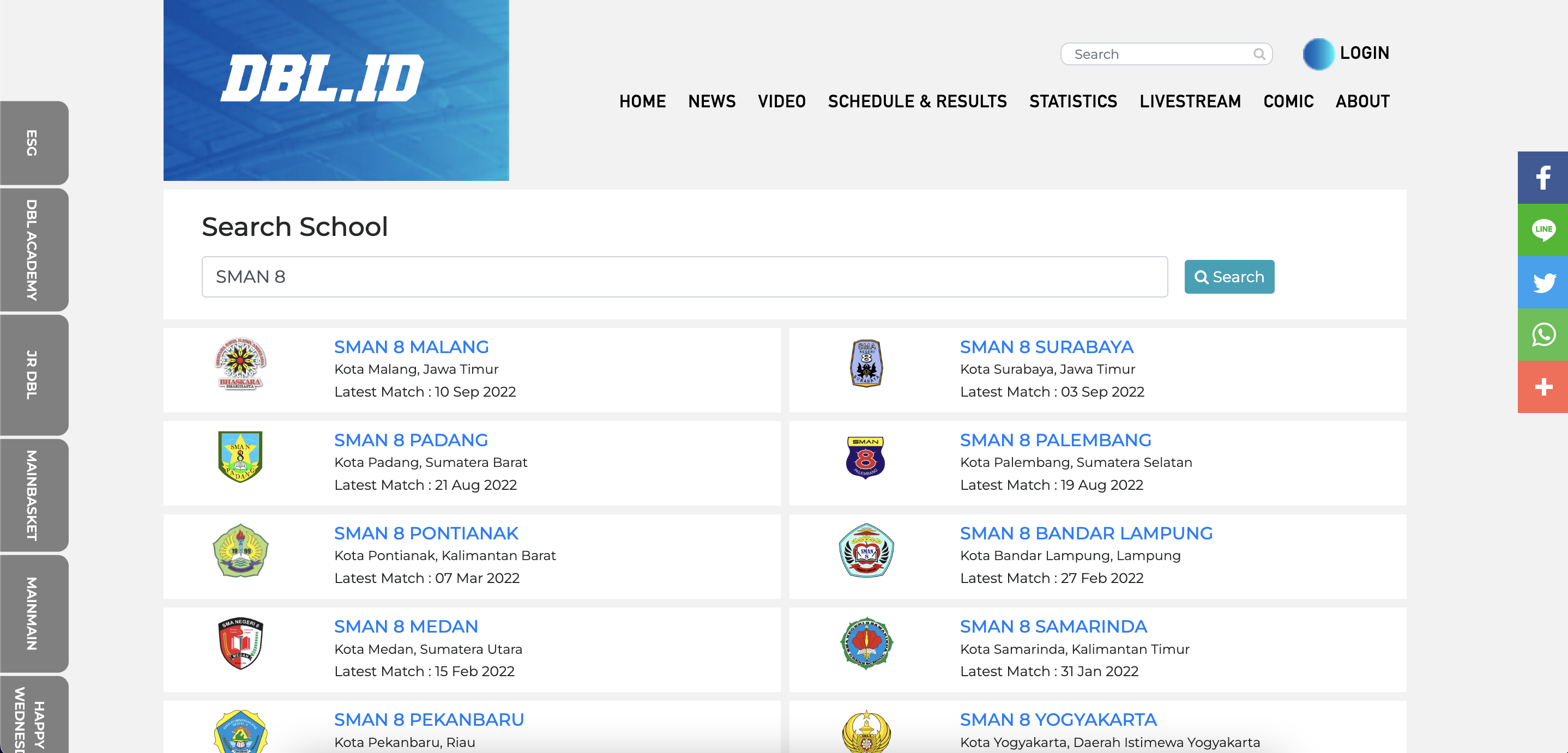 Matches berisi catatan pertandingan yang pernah dilakoni sekolahmu. Dari musim 2019 sampai musim 2022. Jika sekolahmu mengikuti kompetisi DBL untuk kategori cowok dan cewek, di sana pasti akan ada keduanya (Girls/Boys).