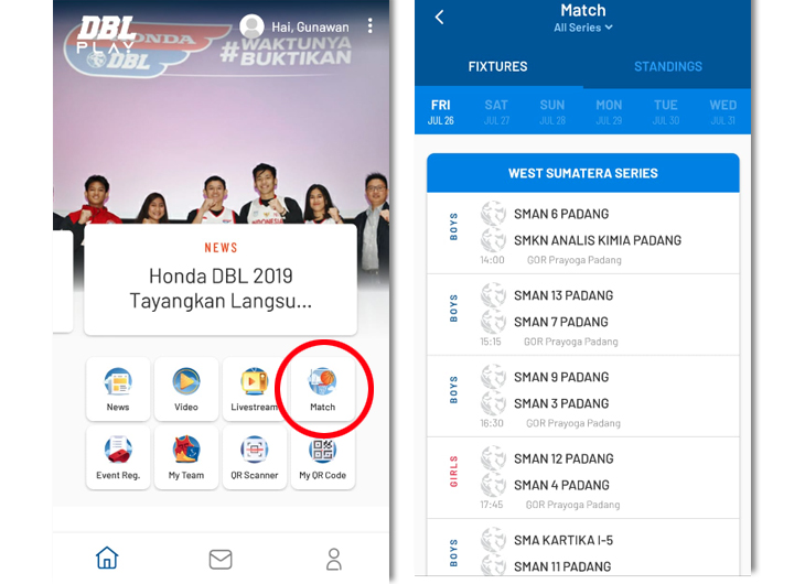 Pertandingan pertana seri Kalsel akan mempertemukan SMKN 3 Banjarmasin melawan SMAN 4 Banjarmasin. Jadwal dan hasil pertandingan selengkapnya bisa kalian pantengin lewat DBL Play. Caranya klik icon bertuliskan Match seperti gambar di bawah ini.