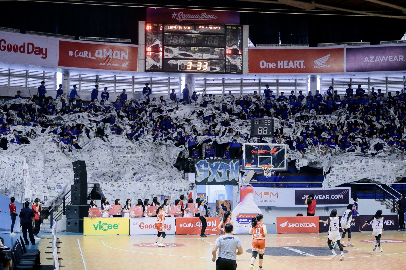 Saat laga tim putri berlangsung, Sixteen membawakan sebuah koreografi yang menakjubkan. Seluruh bagian tribun timur DBL Arena, Surabaya, berselimut banyak koran-koran bekas.