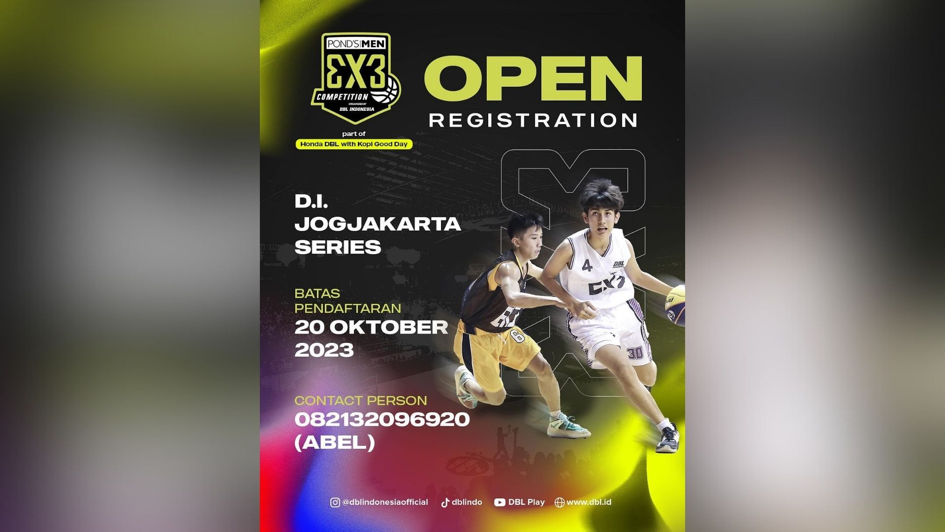 Informasi lebih lanjut mengenai kompetisi Pond’s Men 3X3 Competition 2023 seri Jogjakarta bisa menghubungi contact person dari masing-masing kota atau bisa juga melalui instagram @dblindonesiaofficial dan DBL Play.