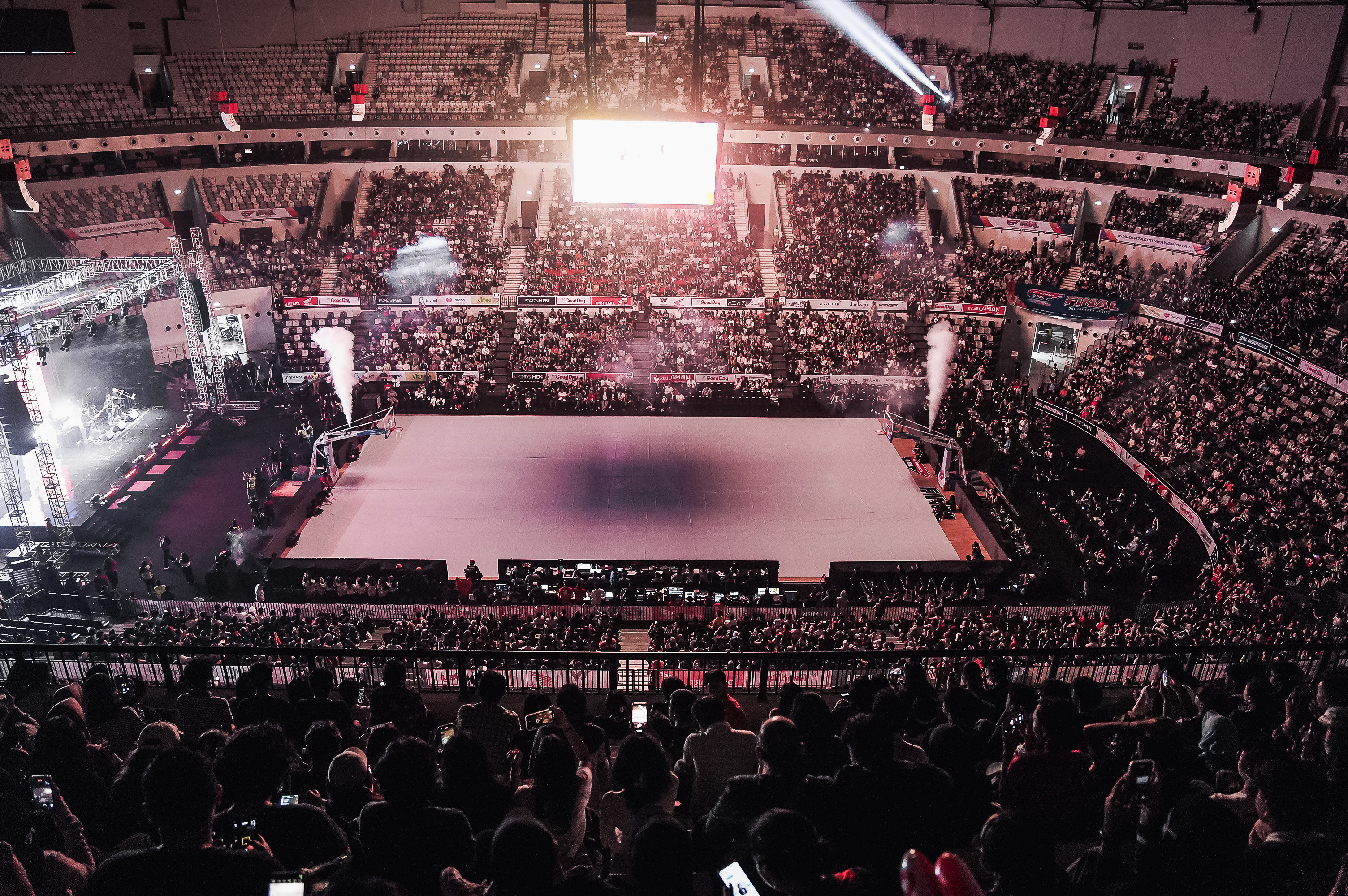 Untuk menyiapkan giant screen ini, DBL Indonesia melapisi lapangan dengan kain putih sebelum pertandingan tim putra dimulai.
