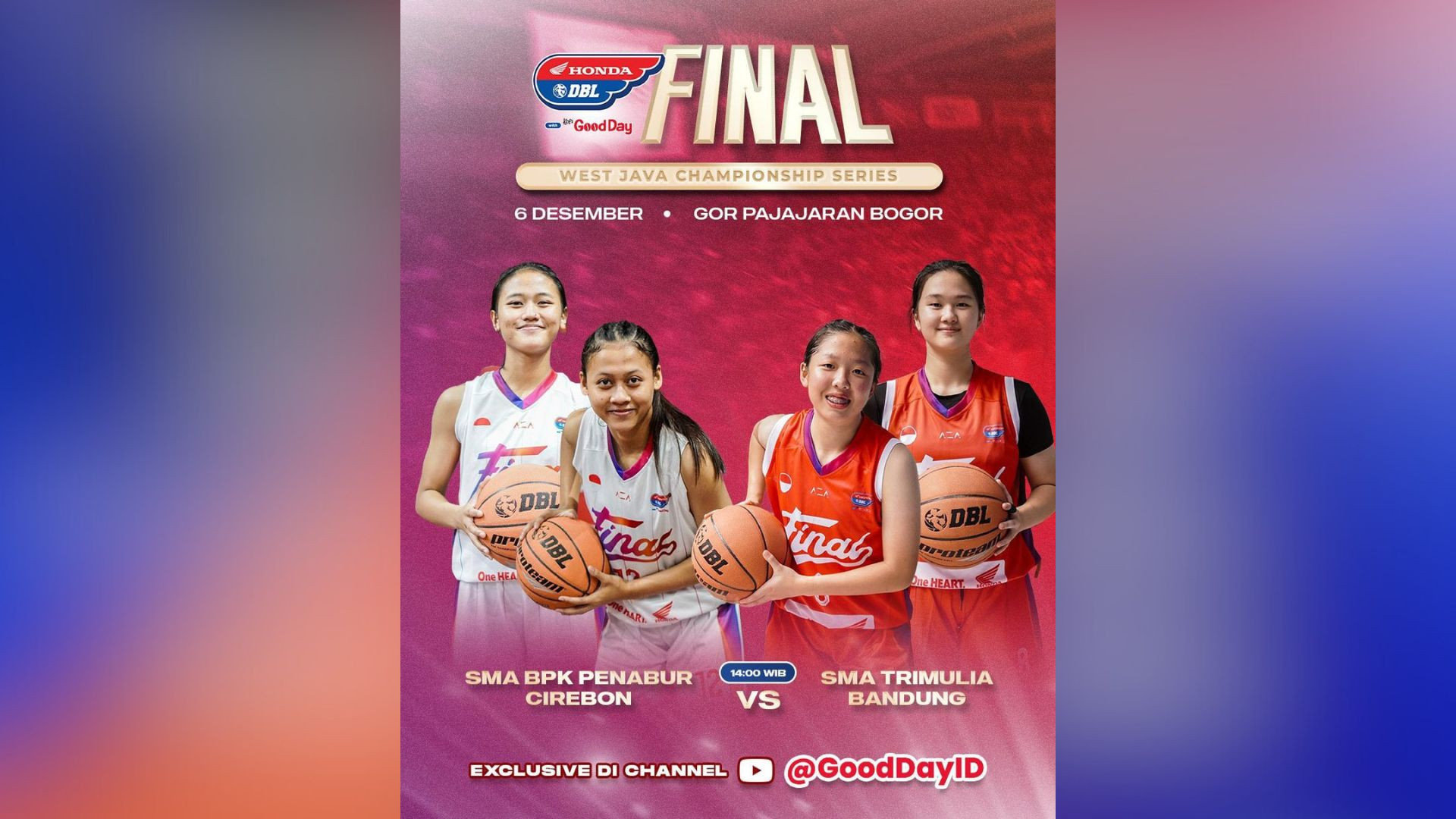 Final Party Honda DBL with Kopi Good Day 2023 West Java Series mempertemukan tim putri SMA BPK Penabur Cirebon kontra SMA Trimulia Bandung. Partai puncak ini bakal berlangsung Rabu, 6 Desember 2023 pukul 14.00 WIB.