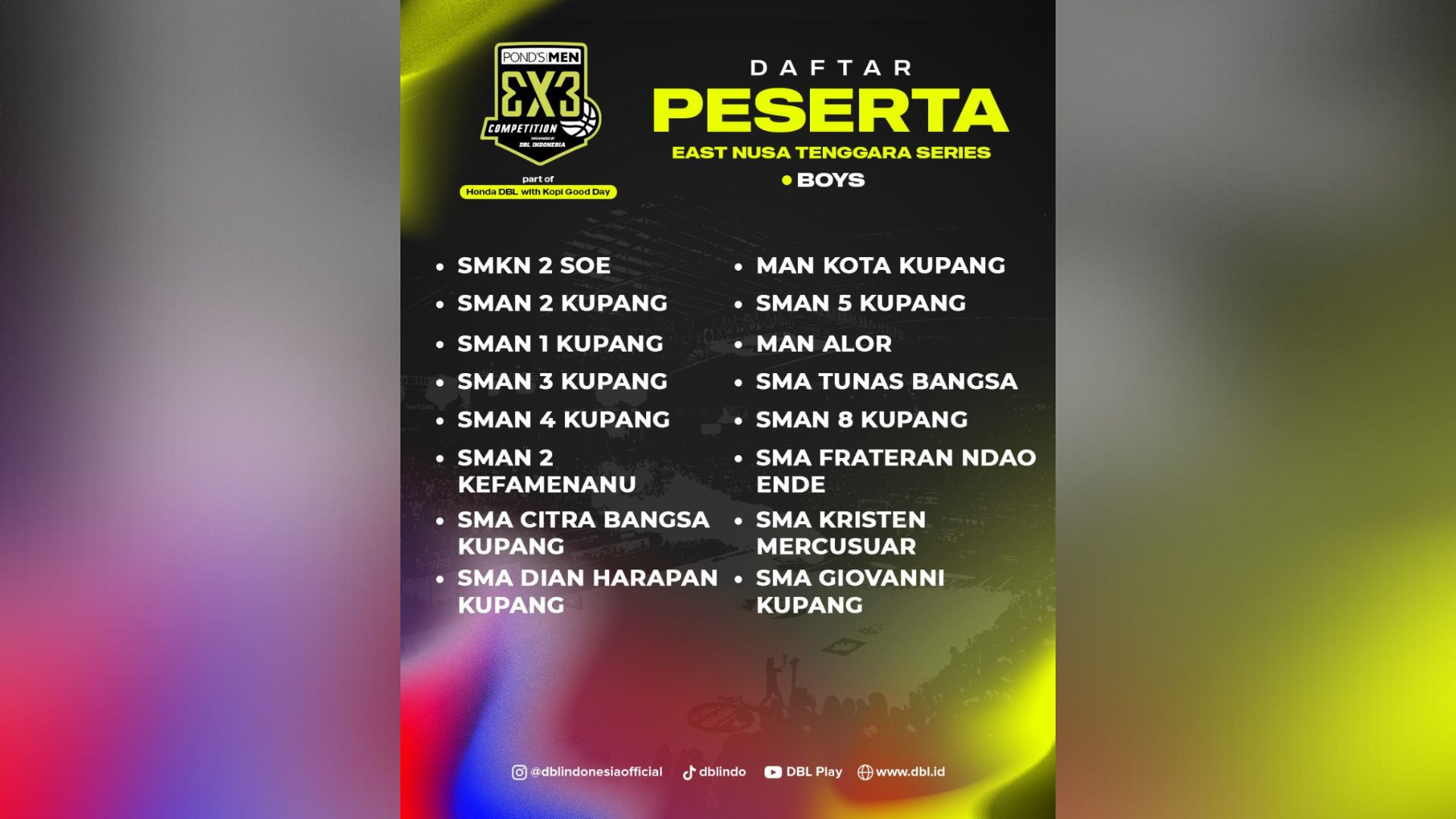 Penyelenggaraan Honda DBL with Kopi Good Day 2023-2024 East Nusa Tenggara Series tidak hanya befokus pada pertandingan basket lima lawan lima dan kompetisi dance saja. Musim ini, Pond’s Men 3X3 Competition 2023-2024 juga bakal menyasar wilayah Kupang.