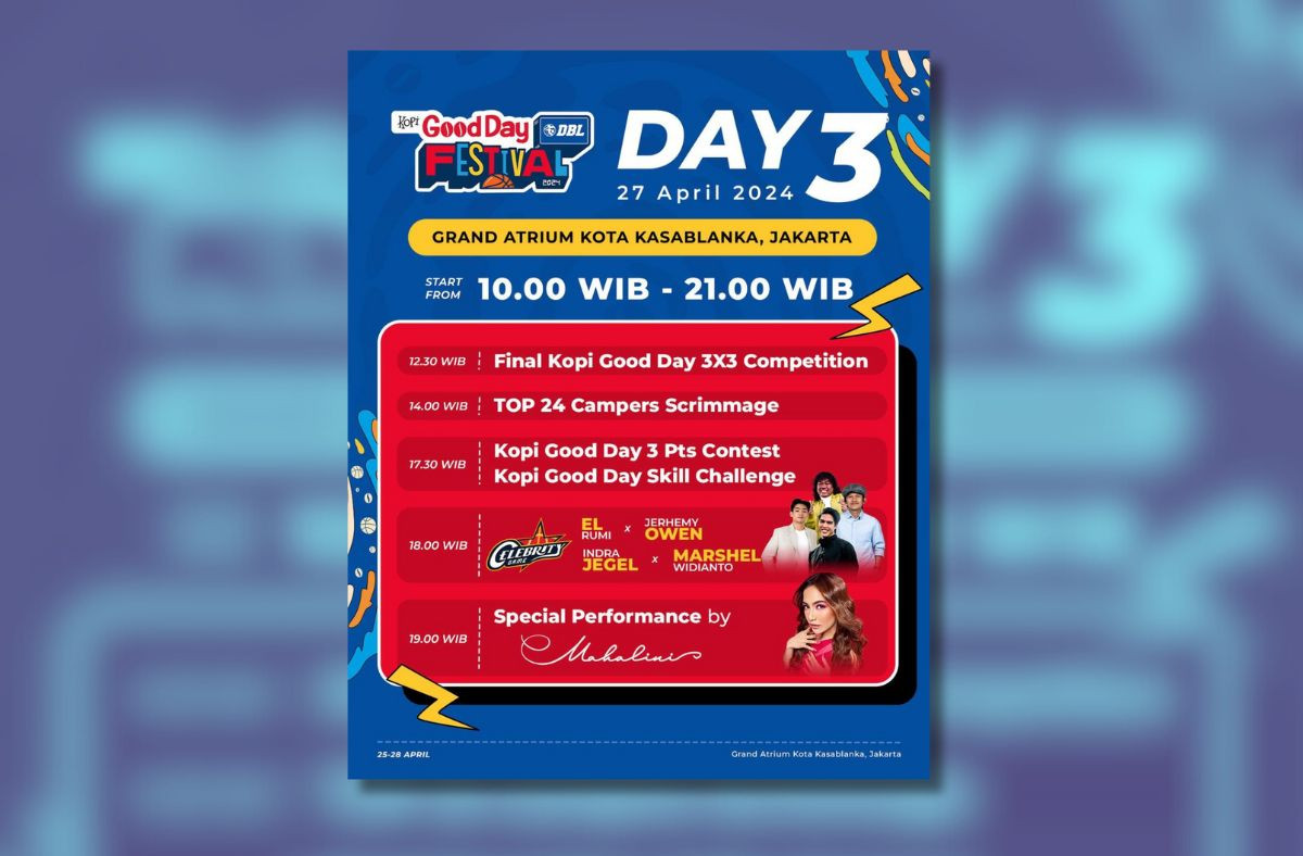 Kopi Good Day DBL Festival 2024 menghadirkan beberapa artis keren dari dunia musik, dance, basket hingga komedi. Nantinya, akan ada Mahalini, Indra Jegel, El Rumi, Jerhemy Owen, hingga Marshel Widianto.