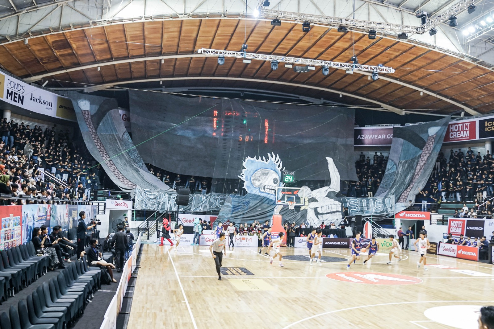 Penonton yang hadir di DBL Arena pada laga SMAN 1 Surabaya melawan SMAN 13 Surabaya di Honda DBL with Kopi Good Day 2024 East Java-North diajak nostalgia oleh Siji Mania -sebutan kelompok suporter SMAN 1 Surabaya-.