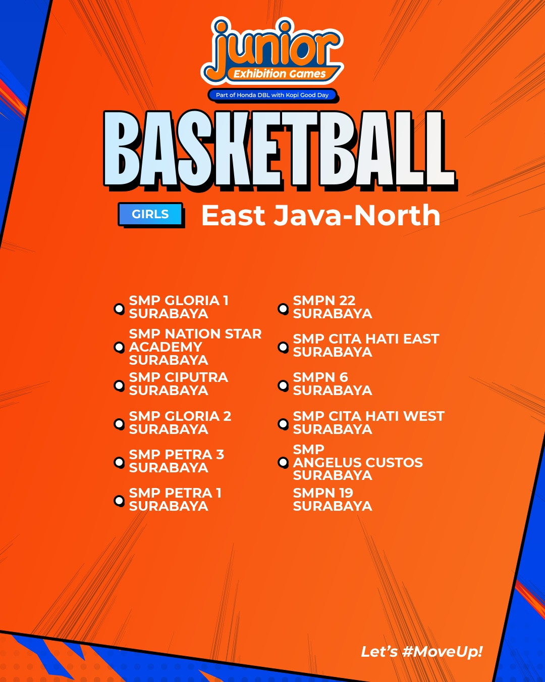 Tidak hanya menyajikan pertandingan lima lawan lima untuk kelas SMA, Honda DBL with Kopi Good Day 2024 East Java-North kembali menghadirkan kompetisi basket tingkat SMP dengan tajuk Junior Exhibition Games 2024 Surabaya.