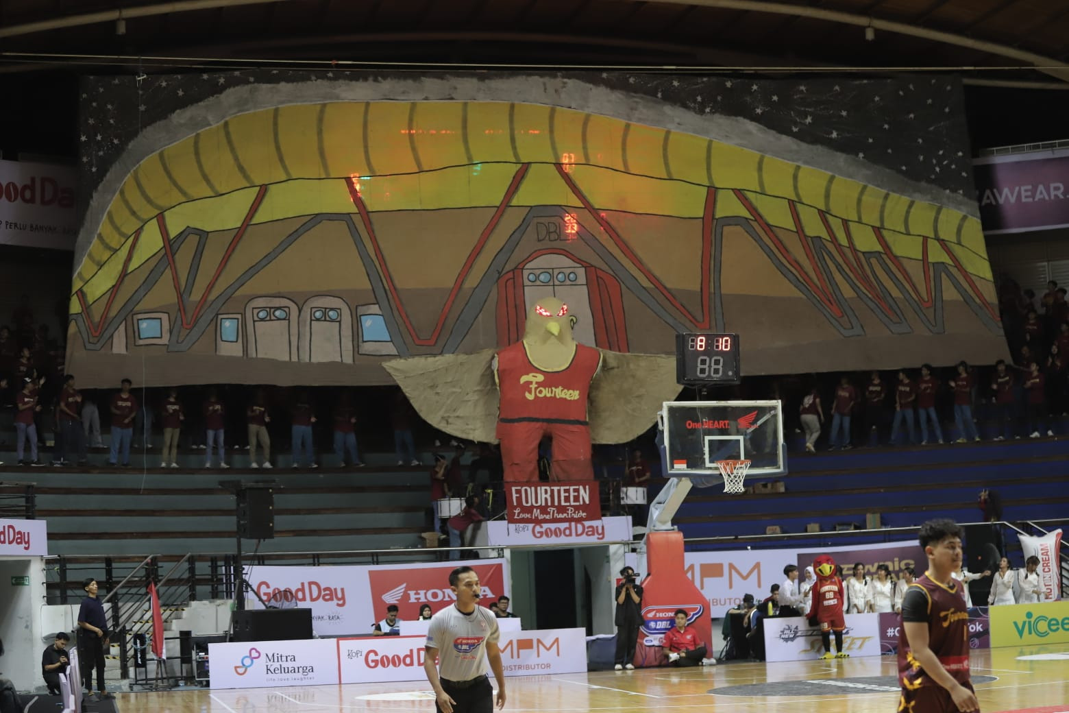 Bukan suporter Honda DBL with Kopi Good Day 2024 East Java-North kalau nggak muncul dengan sesuatu yang baru. Pada match keduanya, Fourteenation (suporter SMAN 14 Surabaya) berhasil membawa koreografi empat dimensi dari maskotnya. Siapa lagi kalau bukan sosok Falcon.