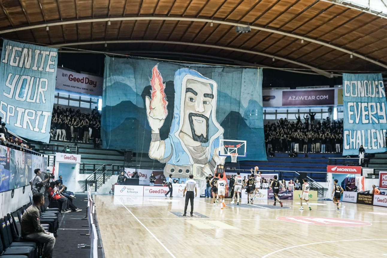 Nggak cuma itu. Aksi mereka semakin sempurna dengan kombinasi tulisan “Ignite Your Spirit” dan “Conquer Every Challenge” yang memenuhi sisi kanan dan kiri tribun timur DBL Arena Surabaya.
