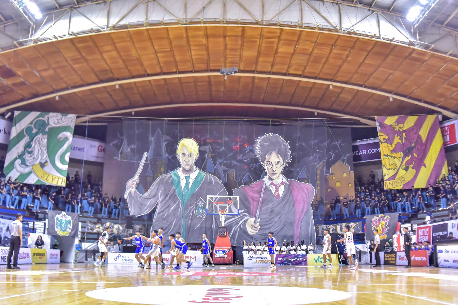 Langkah kreatif ditunjukkan oleh Smandaforce ketika logo tersebut ditarik ke sisi utara dan selatan tribun. Seperti disobek. Layaknya gorden yang terbuka, muncullah sosok Draco Malfoy dan Harry Potter di tengah tribun. Kedua murid dari asrama Slytherin dan Gryffindor ini tampil dengan membawa tongkat sihir mereka.