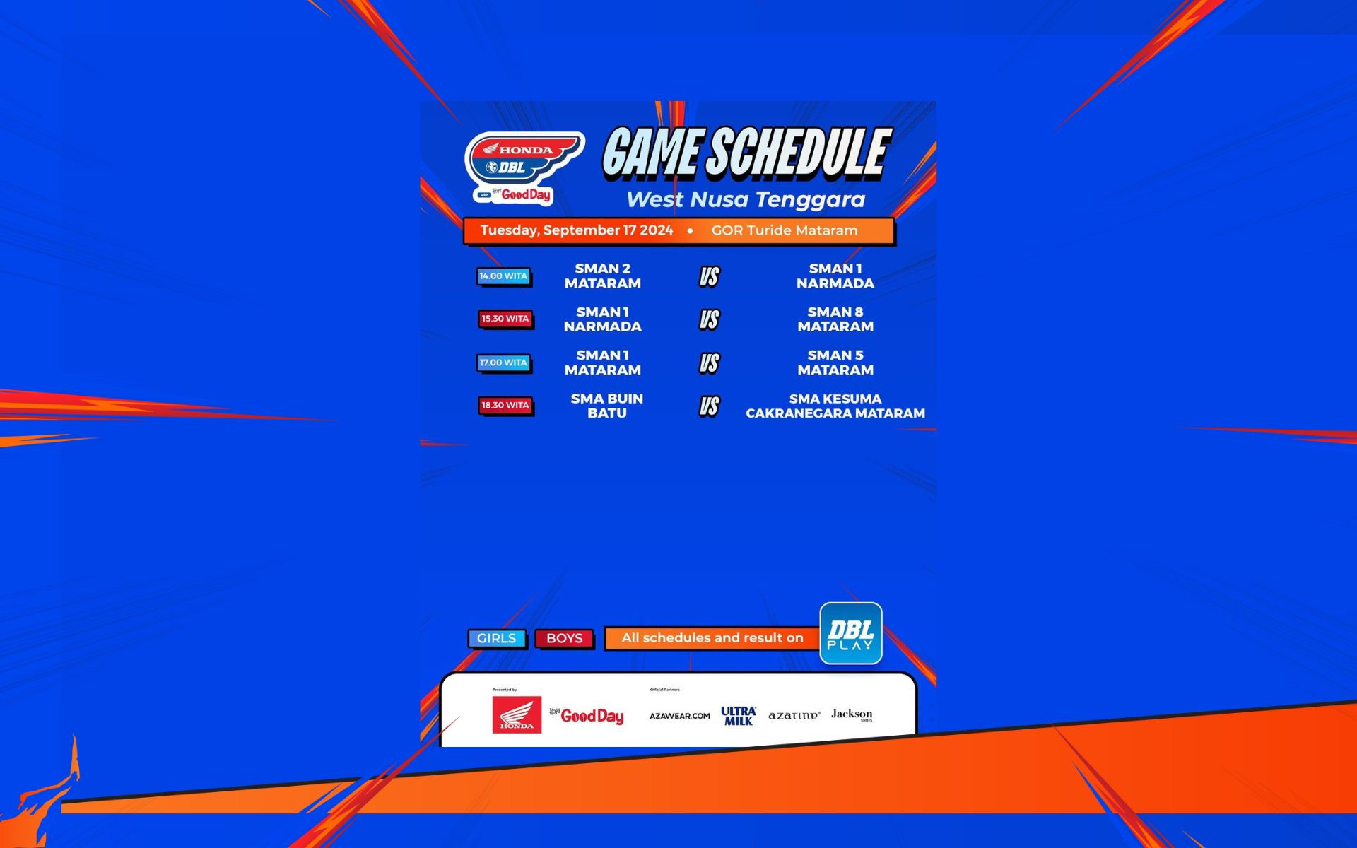 Honda DBL with Kopi Good Day 2024 West Nusa Tenggara memasuki fase genting. Selasa, 17 September 2024 menjadi momen krusial bagi empat sekolah yang bakal berlaga di GOR Turida Mataram.