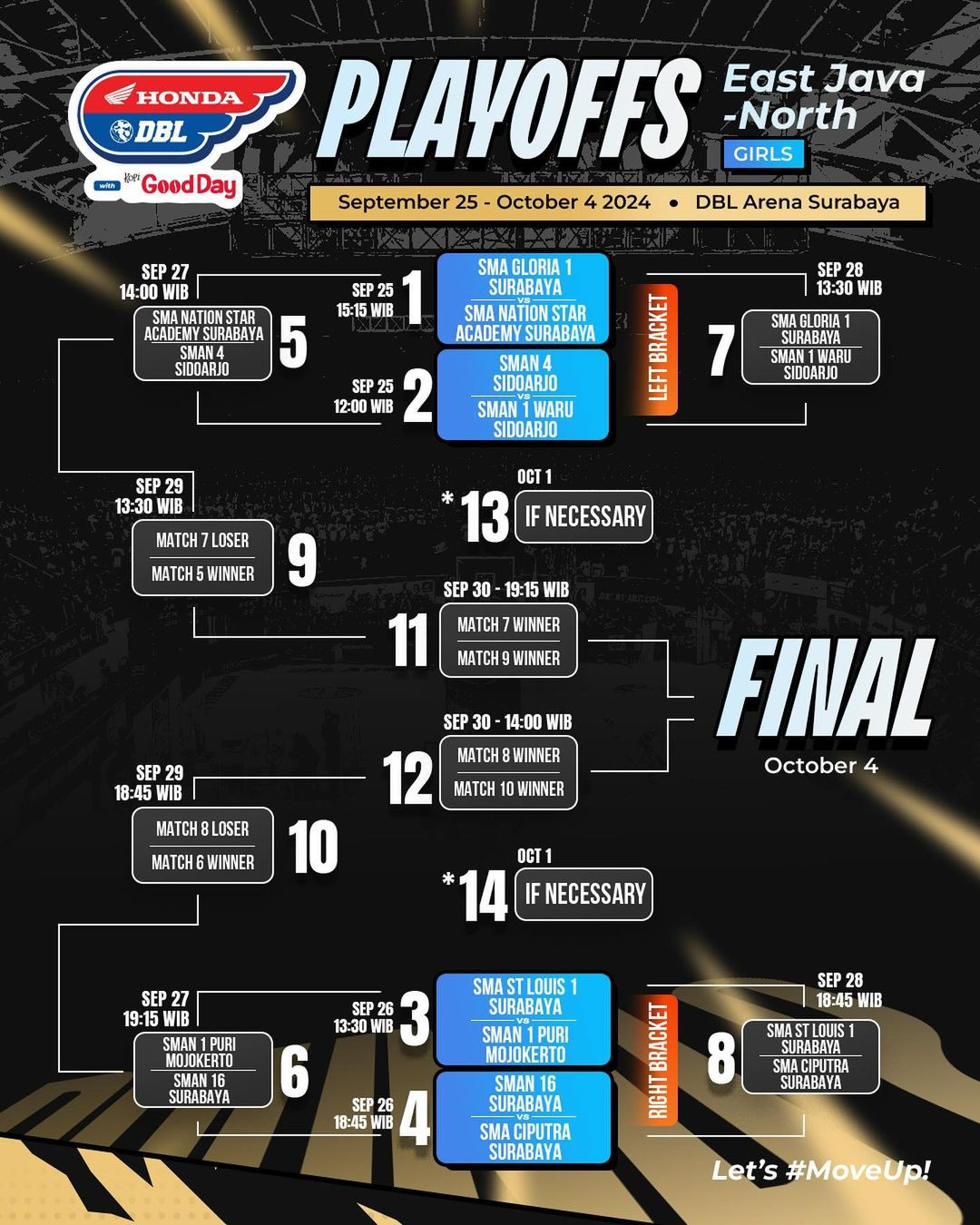 Kemenangan manis SMAN 5 Surabaya pada laga sebelumnya membawa mereka tetap di win bracket dan bertemu dengan SMA Gloria 1 Surabaya. Pertemuan kedua tim ini bakal hadir di DBL Arena Surabaya pada pukul 15.15 WIB.