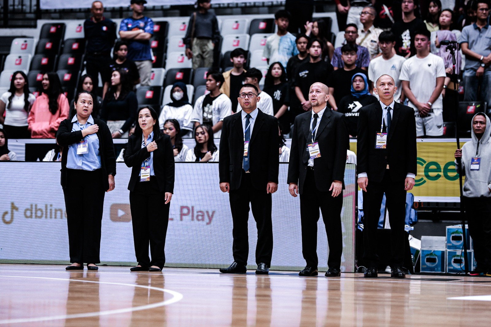 Fachry Asyharuddin (tengah), Pembina OSIS SMAN 70 Jakarta, saat menjadi manajer tim basket di Final DBL Jakarta, Indonesia Arena 2023.