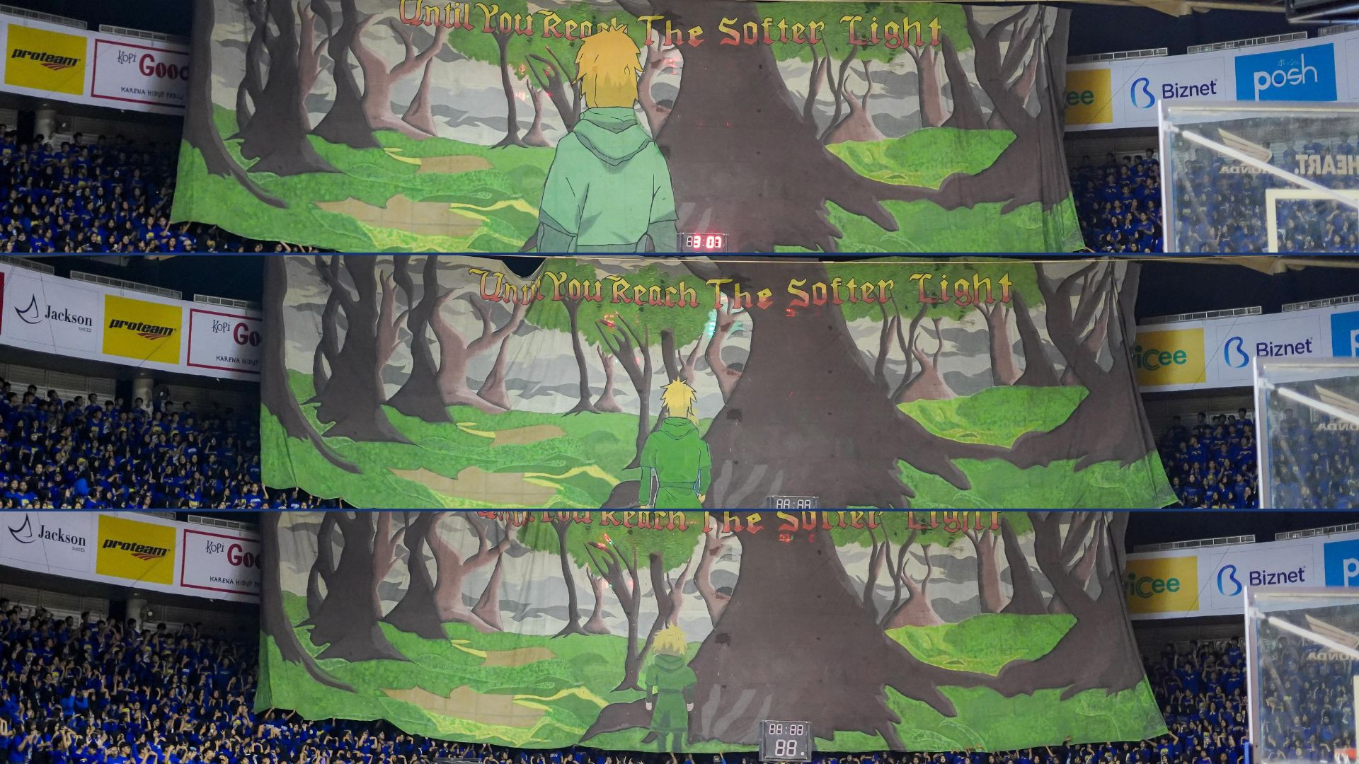 “Kedua, itu kan ada giant banner, kita pakai sudut pandang dari kecil ke besar. Jadi seolah-olah orangnya itu menjauh karena di awal dia sudah tersesat. Nah, di konsep yang kedua, kita nyambunginnya seolah-olah dia itu sudah mencari jalan. Makanya kita pakai sudut pandang orang itu menjauh,” sambungnya.