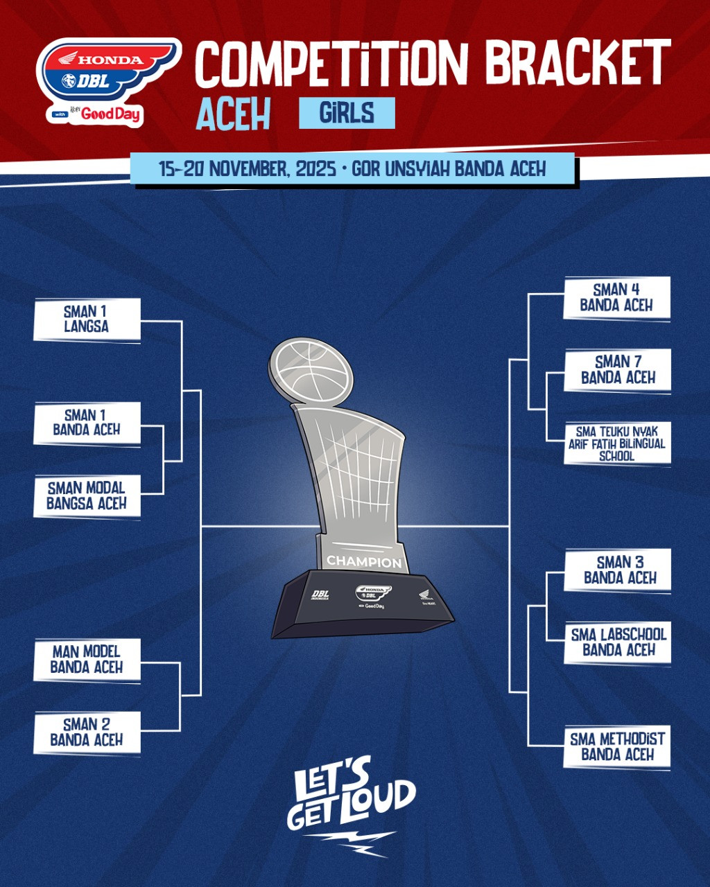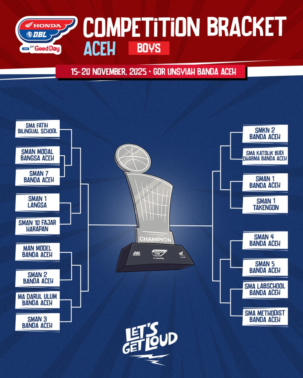 Honda DBL with Kopi Good Day 2025 Aceh akan segera bergulir! Kompetisi basket pelajar terbesar di Tanah Rencong ini akan digelar pada 15–20 November 2025 di GOR Unsyiah Banda Aceh.