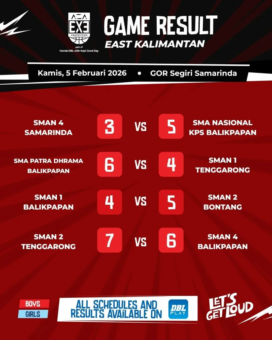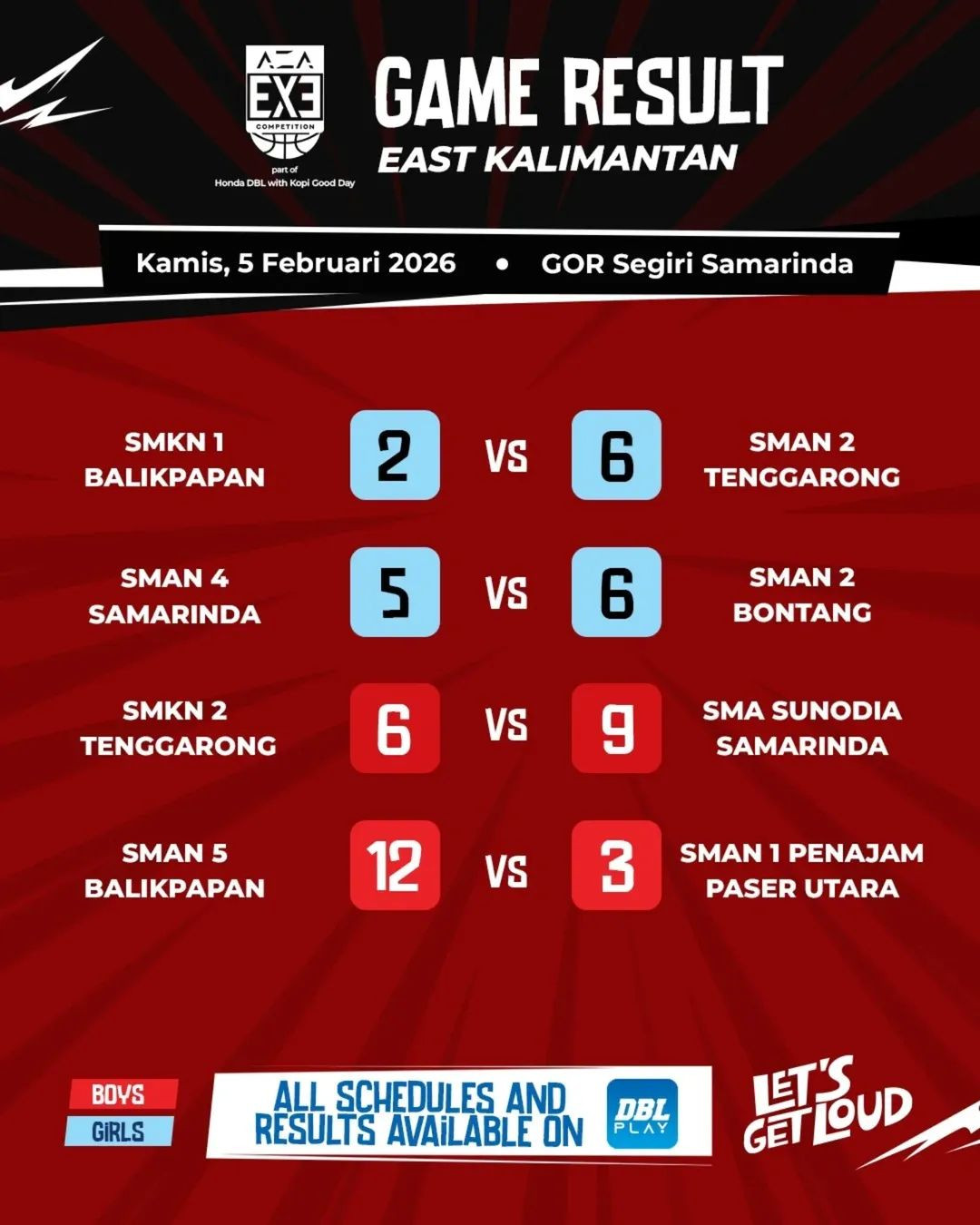 AZA 3X3 Competition 2025-2026 East Kalimantan telah dimulai pada Kamis, 5 Februari 2026. Kompetisi tiga lawan tiga ini menjadi salah satu rangkaian dari Honda DBL with Kopi Good Day 2025-2026 East Kalimantan. Di hari pertama penyelenggaraan ini, sebanyak 16 sekolah bertanding dalam delapan pertandingan beradu aksi memperebutkan gelar juara. Berikut hasil lengkapnya untukmu.