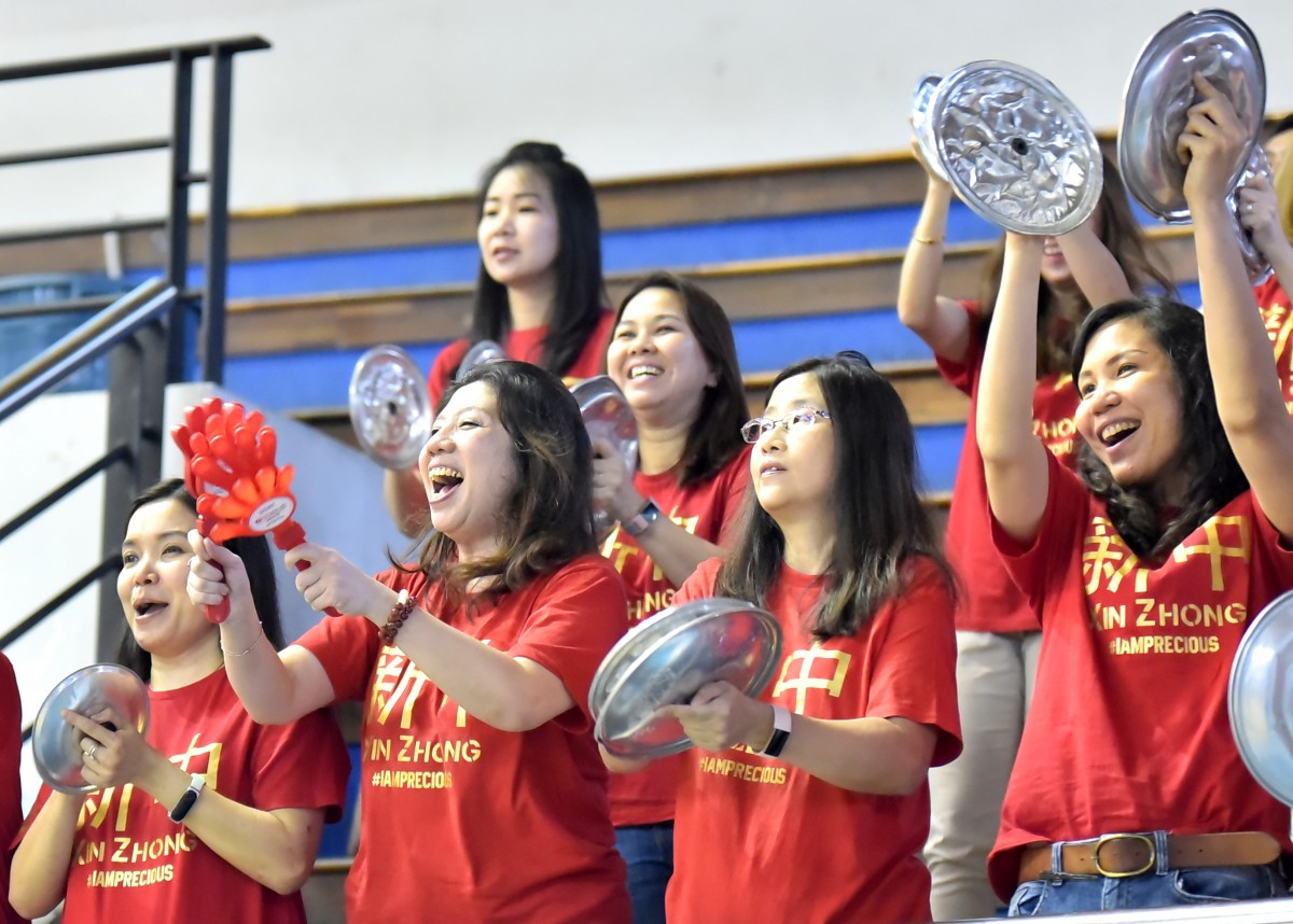 Suporter SMP Xin Zhong Surabaya yang datang dengan baju merah tak mau hanya berteriak saja saat mendukung tim basketnya berlaga. Bahkan semua yang hadir terlihat membawa tutup panci untuk membuat ramai suasana. Semangat ini pun turut mengantarkan tim basket putranya memenangi laga melawan SMP Petra 1 Surabaya. (baca juga: Super Sengit! Xin Zhong Menang Tipis Atas SMP Petra 1 Surabaya)