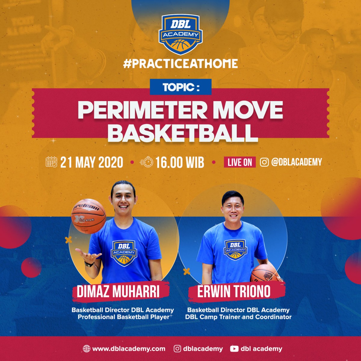 Nggak kerasa udah hari Kamis aja nih. Itu tandanya, DBL Academy bakalan Live di Instagram lagi! Kali ini nggak cuman chit-chat seru bareng coach aja. Tapi kalian juga diajak #PracticeAtHome bareng Coach Dimaz Muharri dan Coach Erwin Triono.